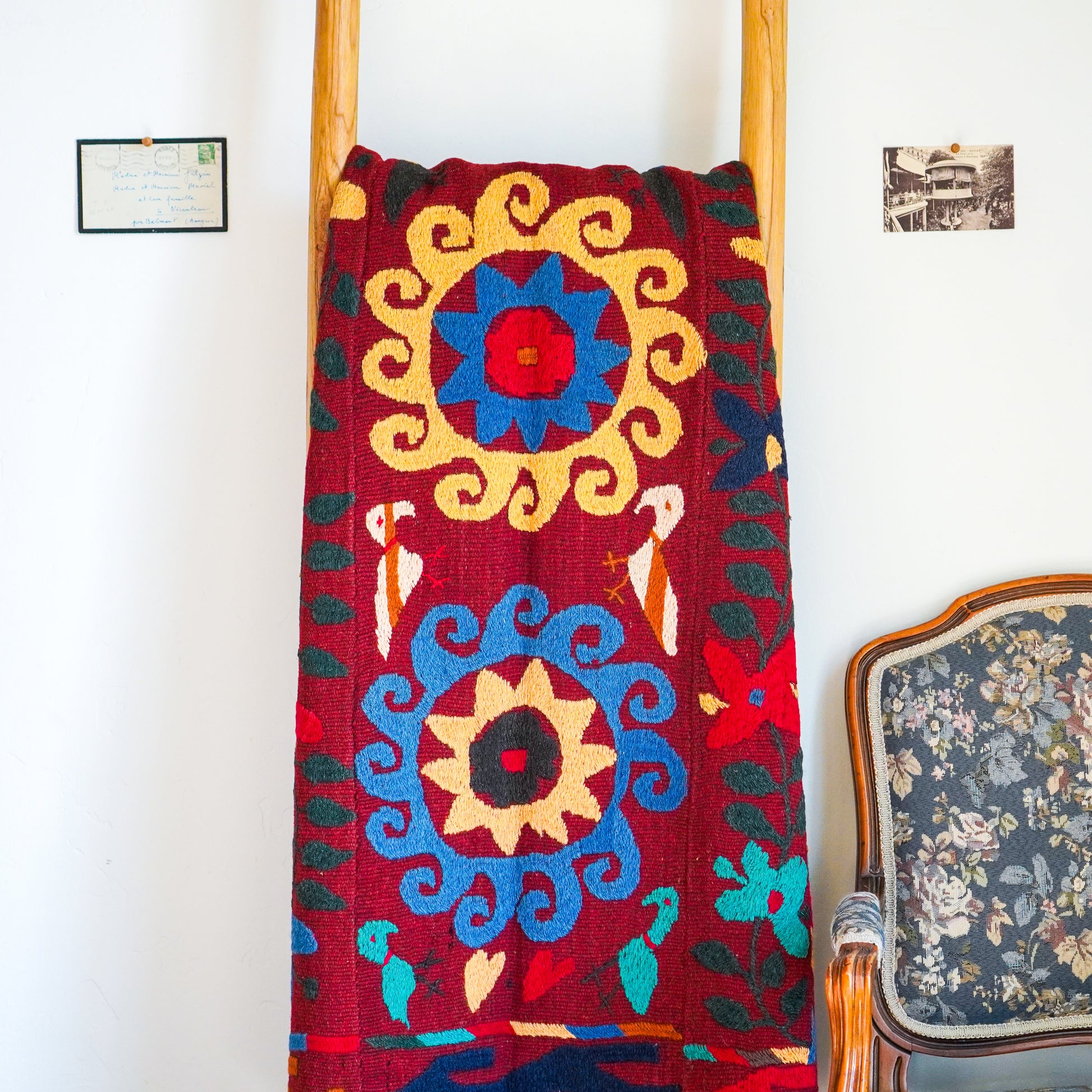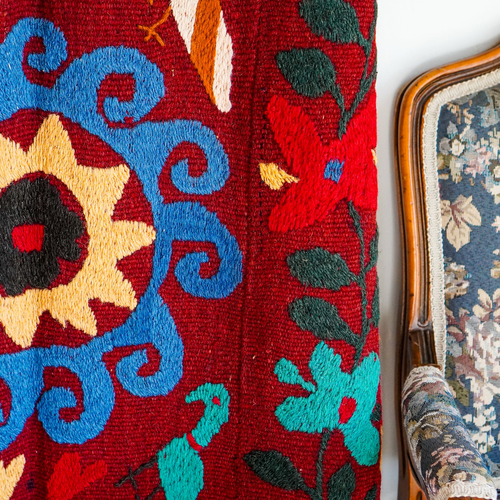 Historically, Suzani textiles were crafted for practical purposes, such as bedcovers, wall hangings, and ceremonial items. Each piece is adorned with intricate motifs, often featuring floral designs, geometric shapes, and symbolic elements that reflect the rich cultural heritage of the region.